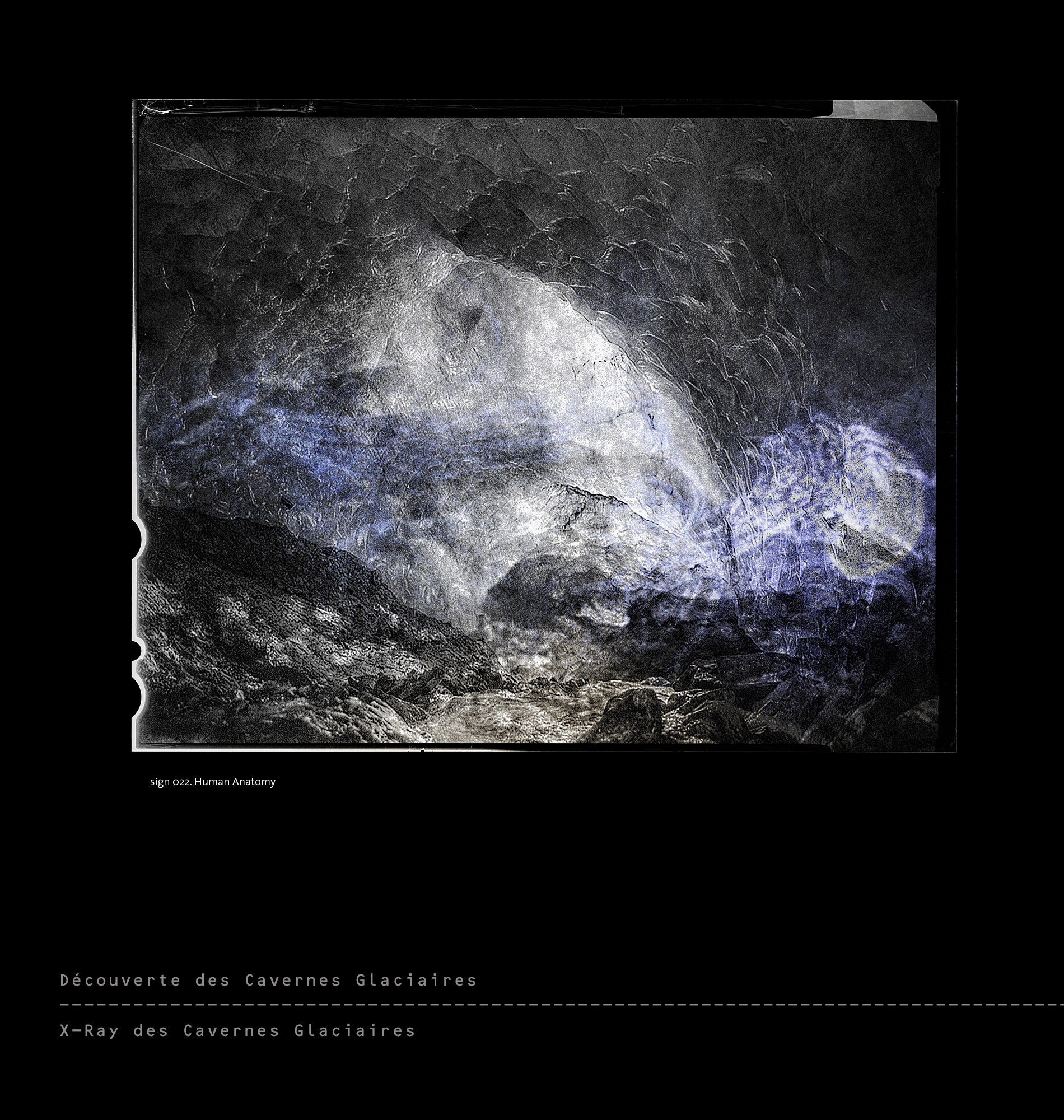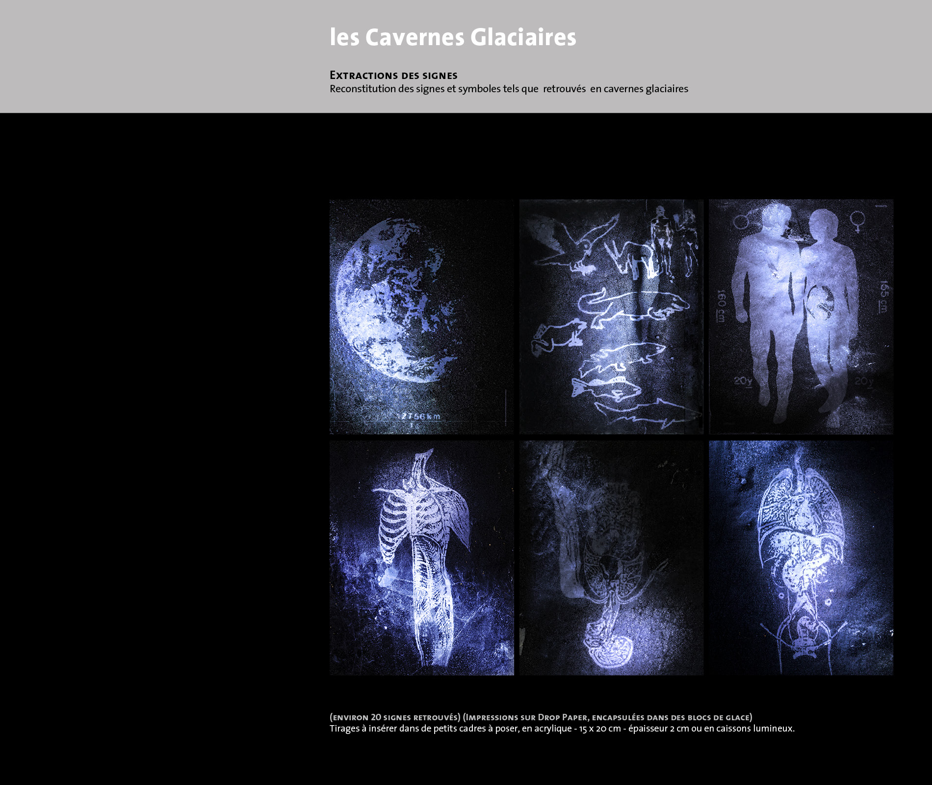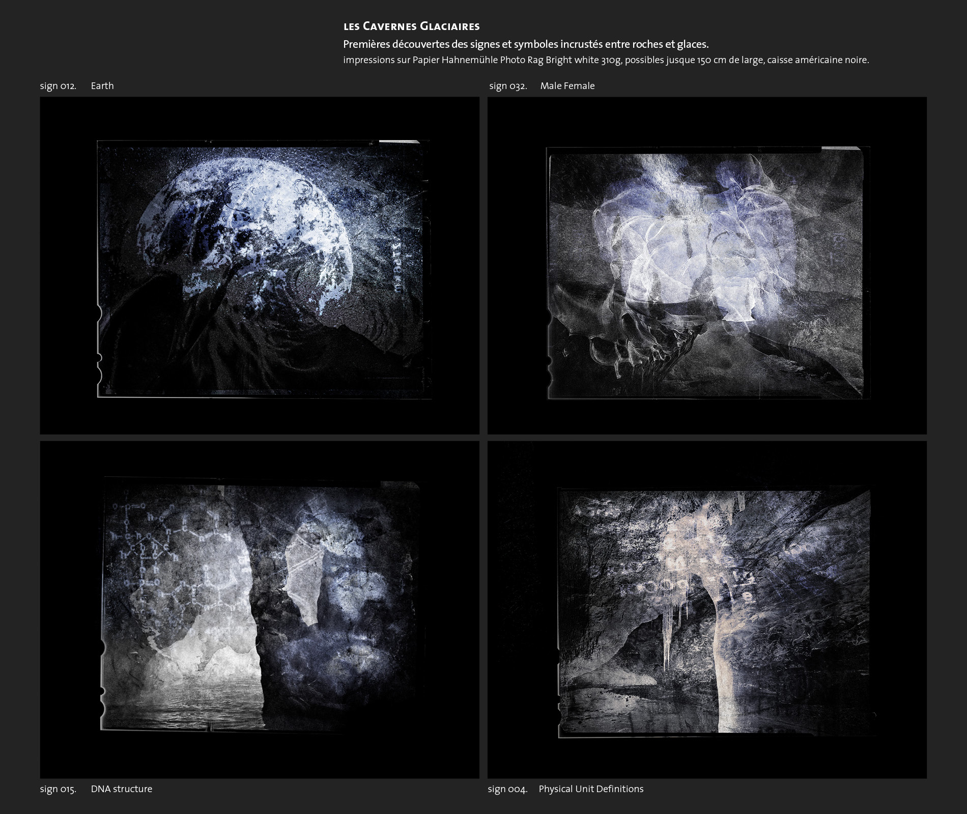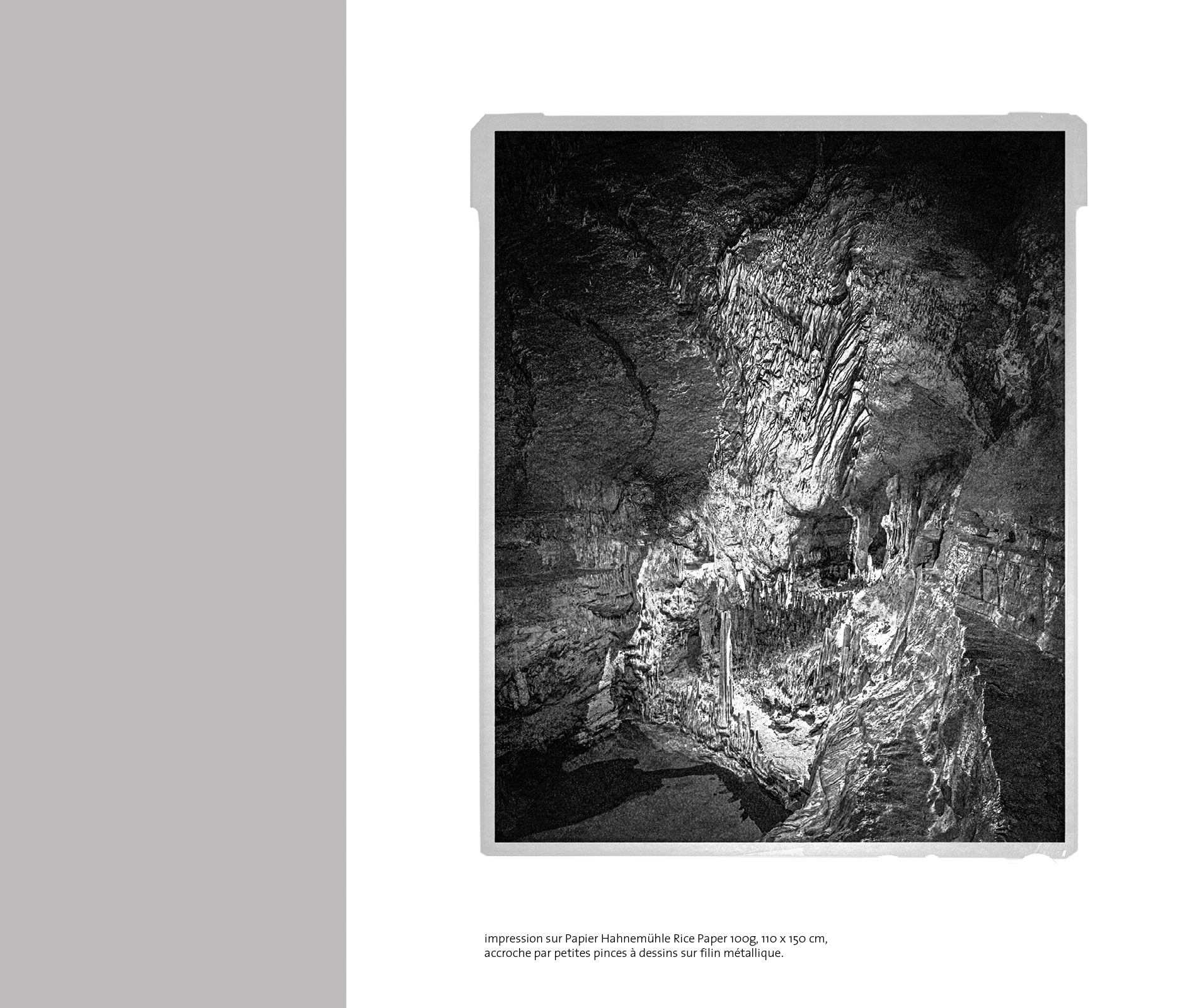 Cette symétrie du temps n’est ici qu’un jeu qui interroge notre désir permanent de laisser des traces de notre présence, lire celles du passé comme imaginer celles du futur. J’offre ces deux temps photographiques pour un voyage imaginaire et poétique, entre la transformation de la grotte d’Arcy-sur-Cure et la découverte archéologique de lointaines et futures cavernes glaciaires.
