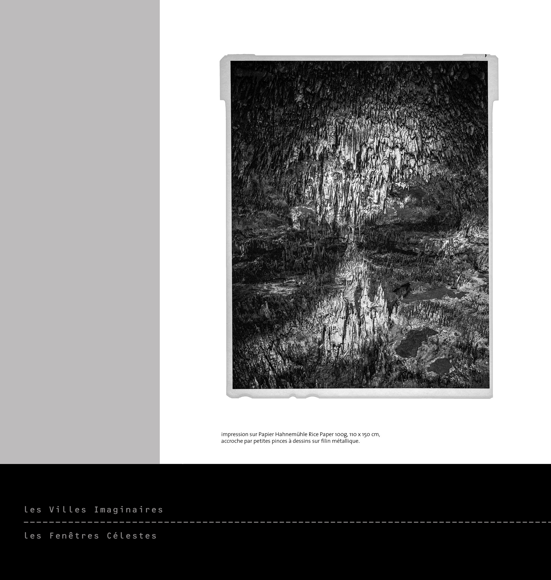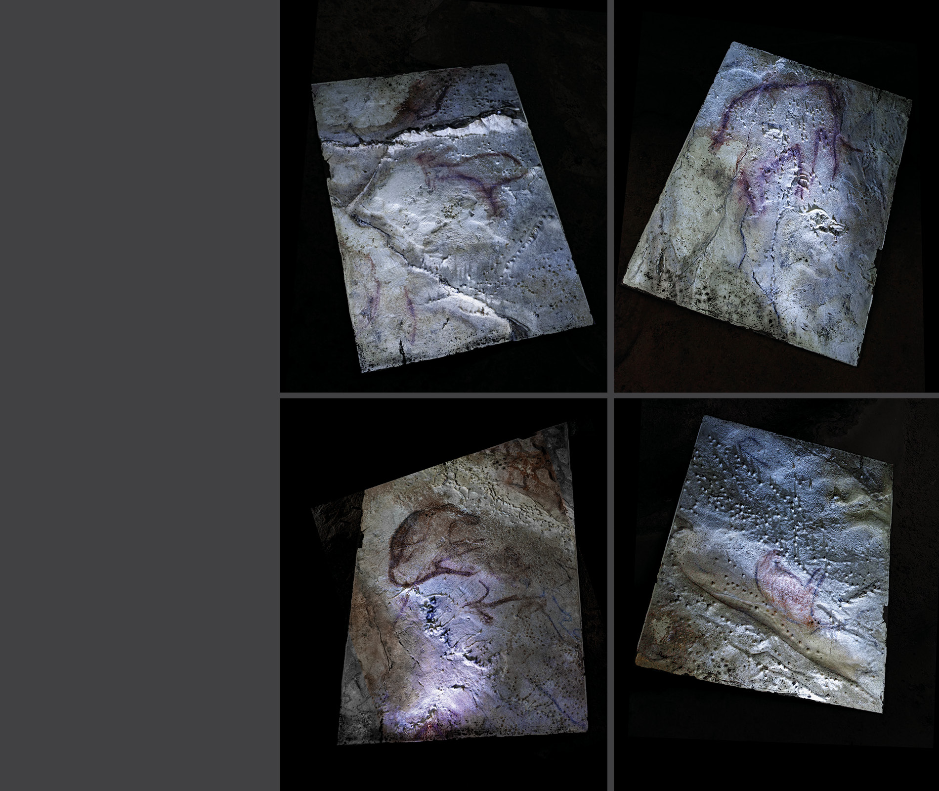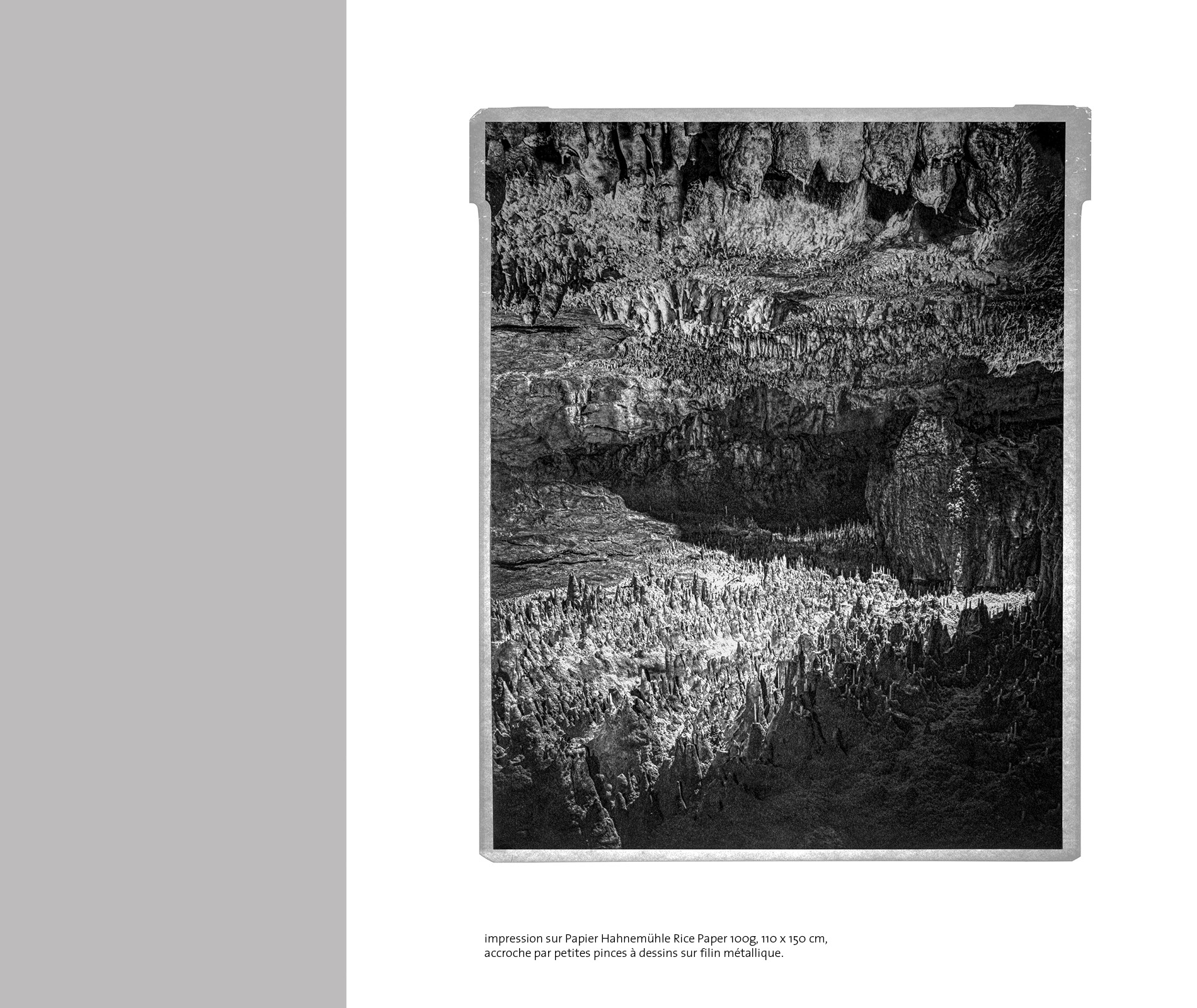 Impressions des vues numériques sur velin d’Arches, et reproduction à la chambre 4x5' afin de retrouver cet aspect d'encrage propre à la gravure.Novembre - décembre 2022 : les Fenêtres Célestes Un miroir pour mieux photographier dessins et peintures peintes en plafond ou sous des creux assez inaccessibles. Un verre spécial pour refléter les volumes et roches, et y réintégrer les signes peints. Souligner les traits et couleurs avec une lumière rasante pour mieux dessiner les reliefs sur lesquels s’appuient les peintures et dessins.